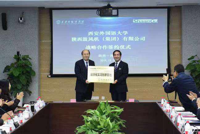 隨后,王校長和李董事長在與會代表的見證下簽署了《西安外國語大學(xué)-陜西鼓風(fēng)機(jī)(集團(tuán))有限公司戰(zhàn)略合作協(xié)議書》,并互授 “國際化實(shí)習(xí)創(chuàng)新基地”牌和“國際化人才聯(lián)合培養(yǎng)基地”牌。